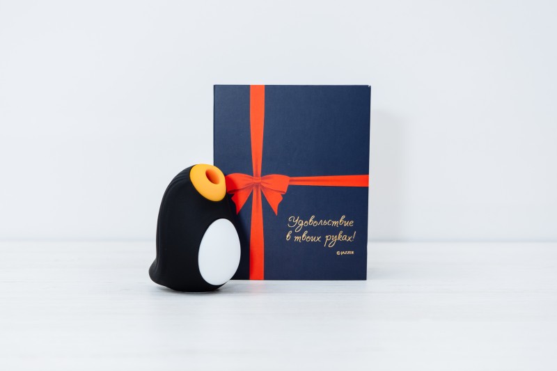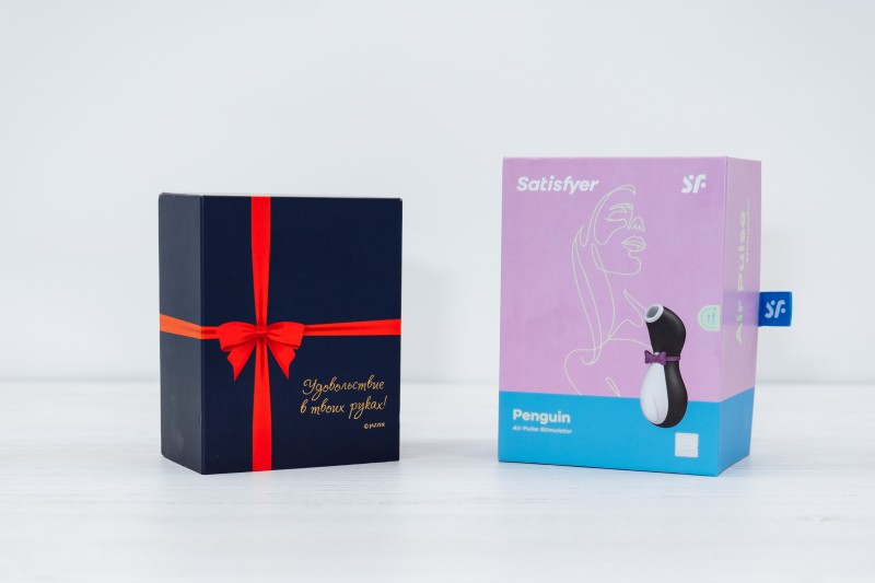 С одной стороны, у Сатисфаера упаковка красочная, а у JAZZER PENGUIN PRO она более скромная, в то же время более стильная и удобная. Черная подарочная коробка украшена красным бантом-принтом. Есть слоган «Удовольствие в твоих руках» и название бренда. Несмотря на стильный вид, слоган никак не выдает содержимое, поэтому вибратор можно подарить даже без дополнительной маскировки.