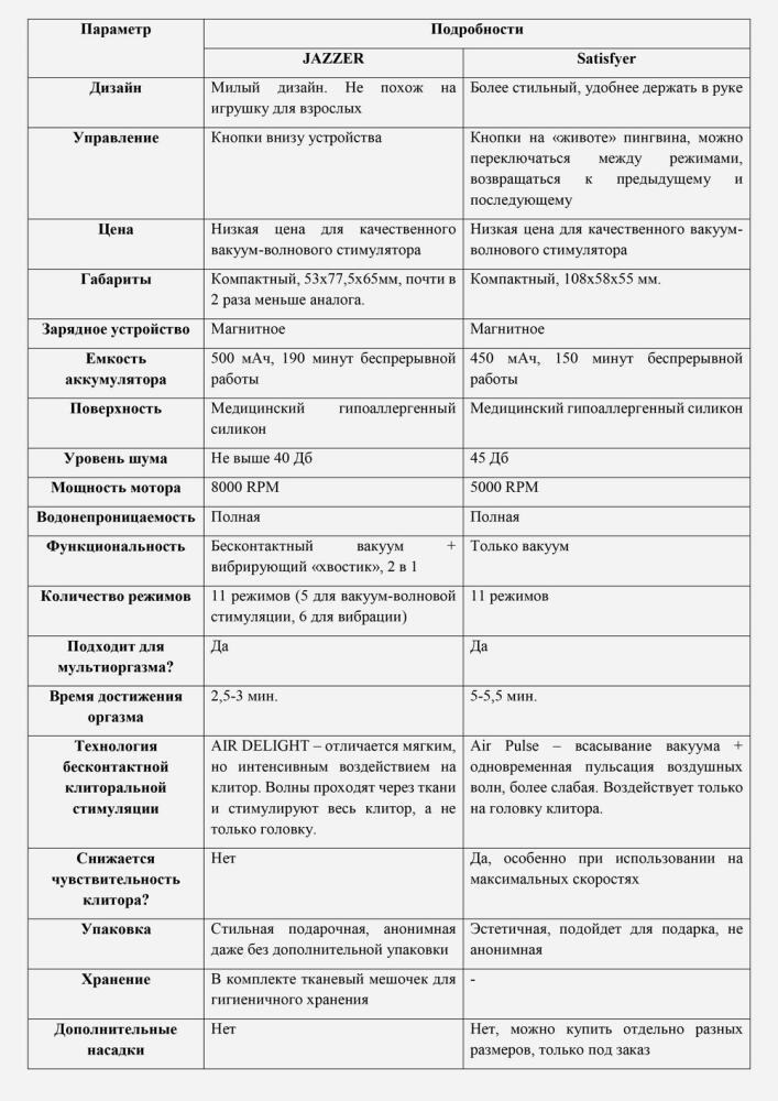 Несмотря на очевидные сходства, у вибраторов JAZZER и Satisfyer есть отличия — часть их них, например, можно увидеть в таблице.