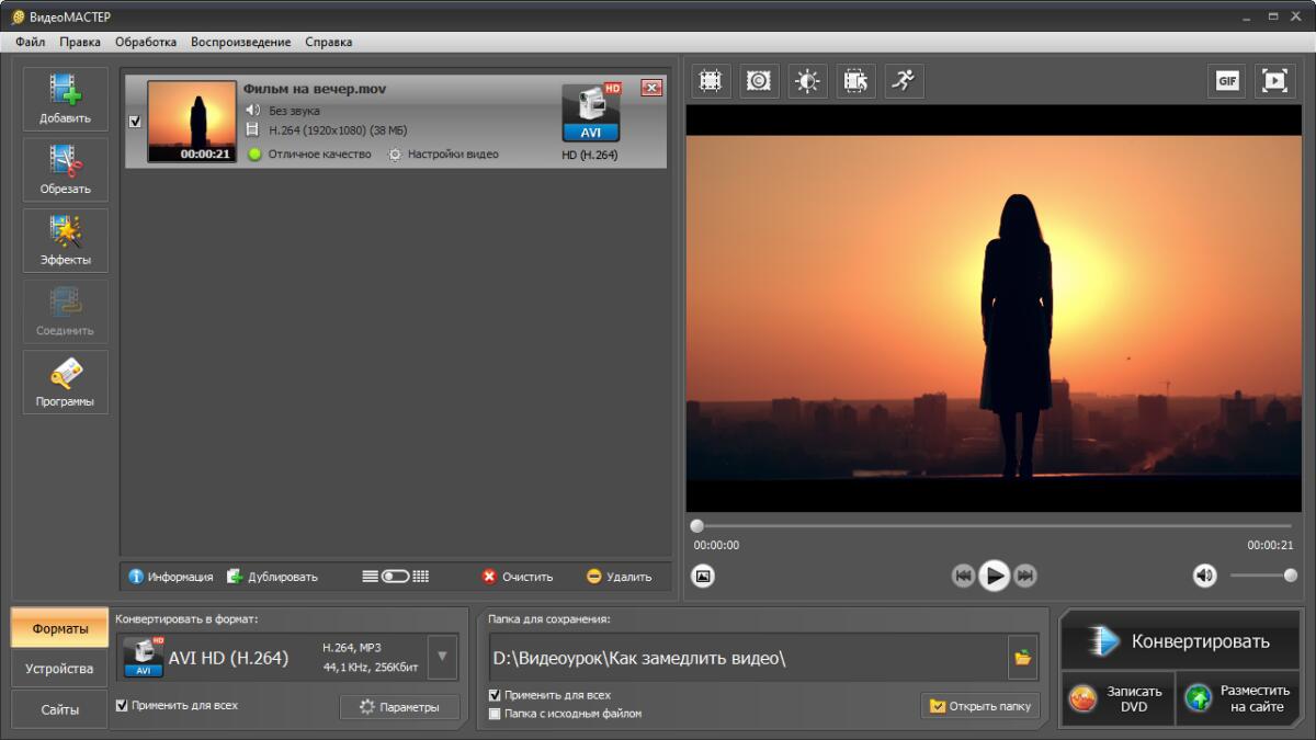 Перед конвертацией можно выполнить настройки для будущего видео и выбрать: