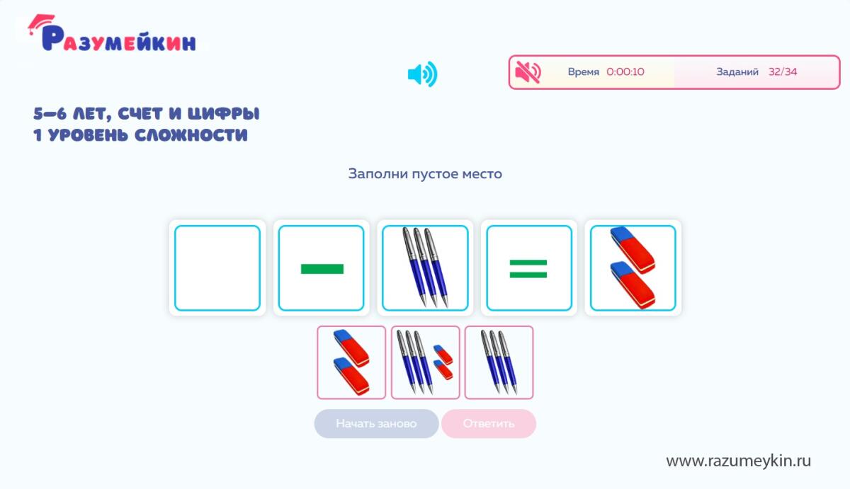 Развивающая онлайн-игра «Разумейкин» — платформа для самостоятельного обучения ребенка дома. Дошкольник быстро изучит цифры, научится считать, складывать и вычитать, освоит основные математические операции и понятия.