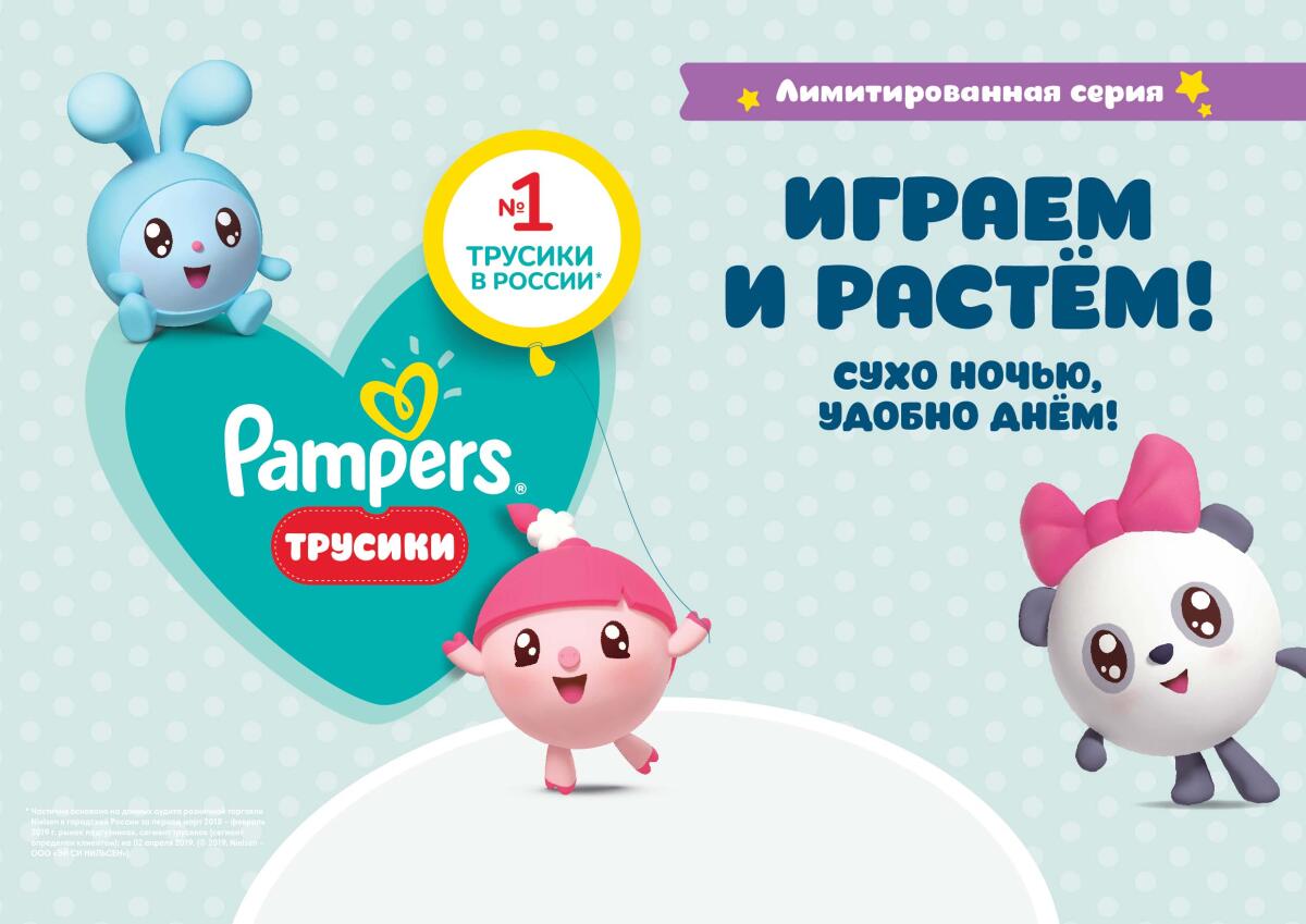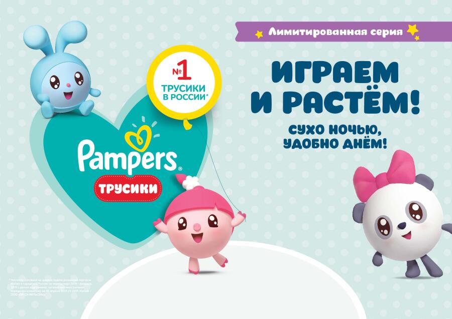 Подгузники-трусики № 1* в России и первый российский анимационный сериал для малышей вступили в коллаборацию, чтобы вместе помогать маленьким девочкам и мальчикам развиваться с комфортом и удовольствием. На упаковках и самих трусиках лимитированной серии Pampers впервые появились изображения персонажей «Малышариков»! Теперь родители могут превратить смену подгузника в веселую игру и быть уверенными, что малышу обеспечены сухость и удобство, благодаря анатомической посадке, технологии мгновенного впитывания и воздухопроницаемым материалам. Эти трусики подойдут всем маленьким непоседам, начиная с 4 месяцев, и они смогут активно изучать мир, развиваться и играть вместе с любимыми героями из «Малышариков».
