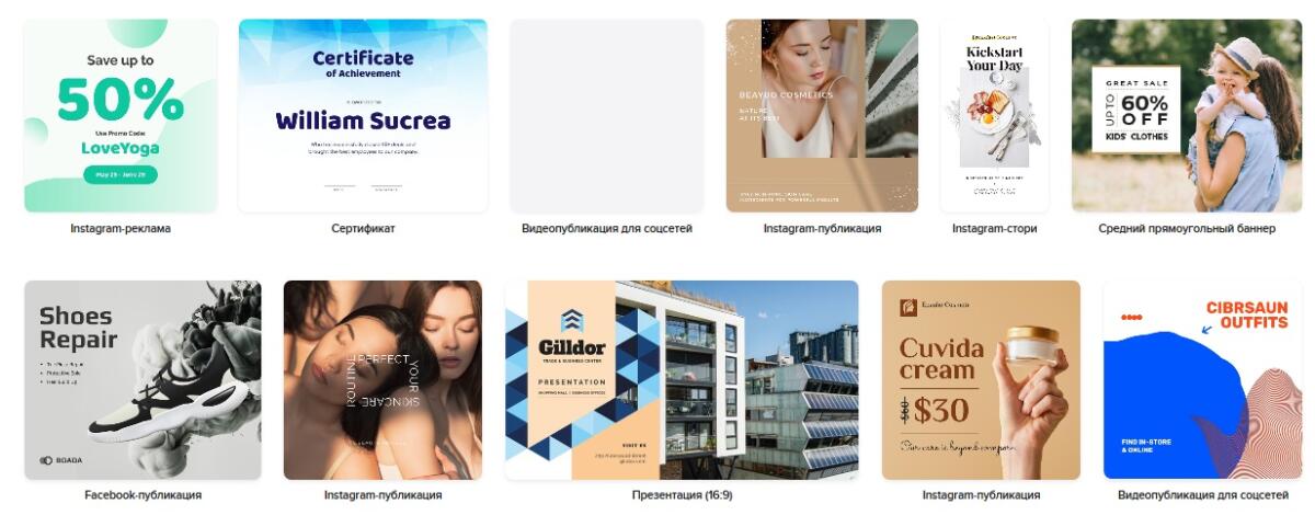 - 45 форматов — визитки, презентации, коллажи, обложки для ютуб, посты в соцсети, открытки, баннеры, логотипы;