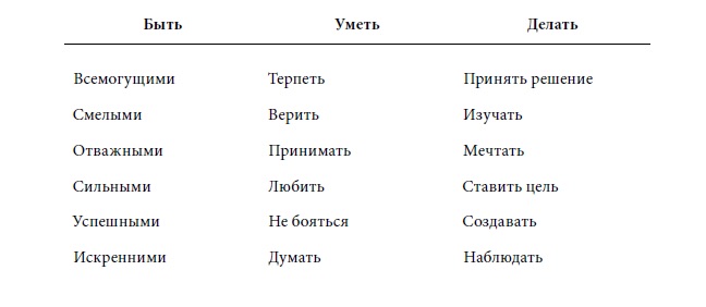 А теперь вспомните момент, когда вы одновременно были всемогущим, смелым, отважным, искренним и далее по списку из первой колонки? В вашем детстве это было абсолютно естественно и «даром». После человек учится, приобретает навыки, читает книги, кому-то что-то доказывает только для того, чтобы опять стать счастливым. Однако детская непосредственность всегда остается в нас, как и счастье. Как сказал Зигмунд Фрейд, «счастлив тот человек, который смог реализовать свои детские мечты». Чтобы понять, что делает вас счастливыми, что дает вдохновение, нужно вспомнить и осуществить их.