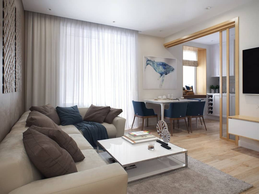 Драпировки на шторах уместны почти всегда: помните, что на них нужно закладывать дополнительную ширину ткани, портьеры должны быть примерно в 2,5 раза длиннее карниза. В тесной комнате лучше всего вешать максимально лаконичные шторы с минимумом оборок.