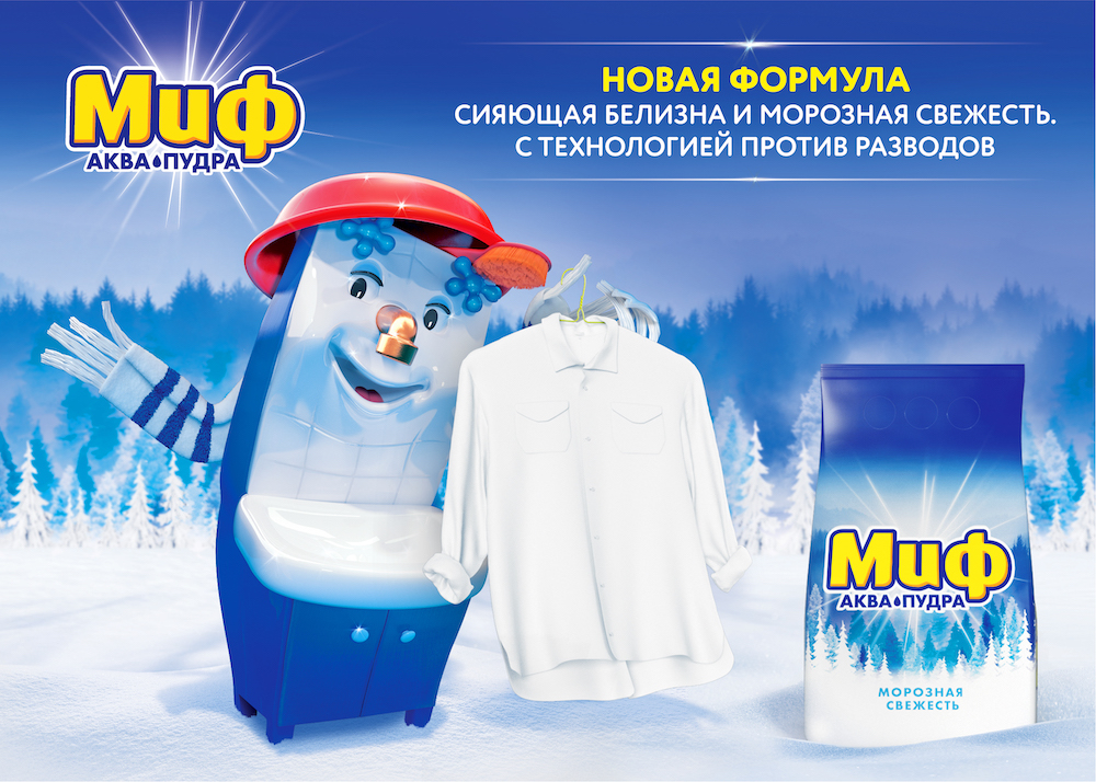 «Миф» был поддержан новой рекламной кампанией на телевидении: новый «Миф» — это целый новый мир! Запах морозной свежести переносит семью в зимний лес. В мире пушистого снега нет места пятнам — если присмотреться, все вокруг сделано из кристально-белого белья! Благодаря улучшенной формуле новый «Миф» справится со следами, а сон на белоснежных простынях будет так же прекрасен, как на свежем воздухе.