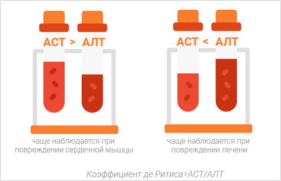 При постановке диагноза врачи обращают внимание на соотношение уровней АСТ/АЛТ — так называемый коэффициент де Ритиса. В норме этот показатель составляет 0,8−1,33.