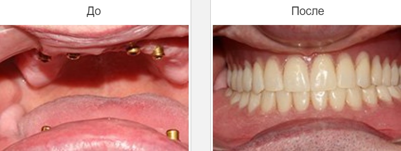Более практичный вариант — полные протезы на 4−6 имплантах, которые могут прослужить без коррекции около 10 лет. Они относятся к условно-съемным, так как снять их может только стоматолог. Важно, что эти протезы восстанавливают жевательную функцию и предотвращают атрофию костной ткани, связанную с удалением корней зубов.