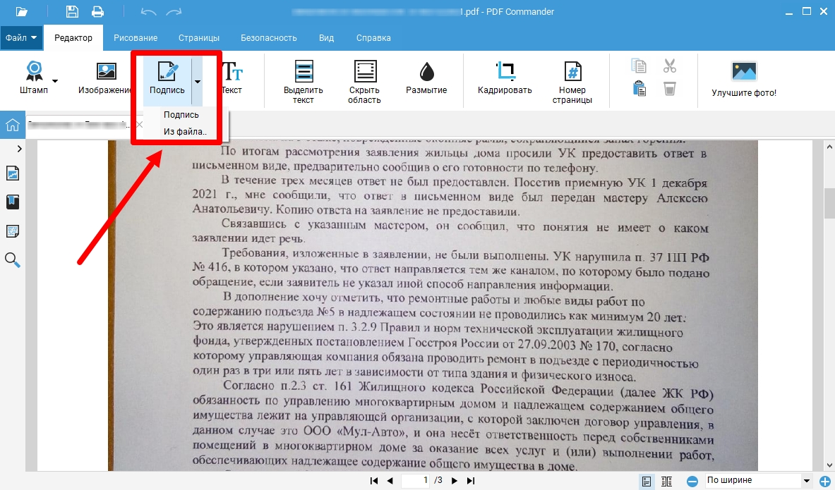 Чтобы загрузить готовый автограф в формате изображения, кликните по пункту «Подпись», далее в выпадающем списке — «Из файла». Переместите изображение в нужную область на странице.