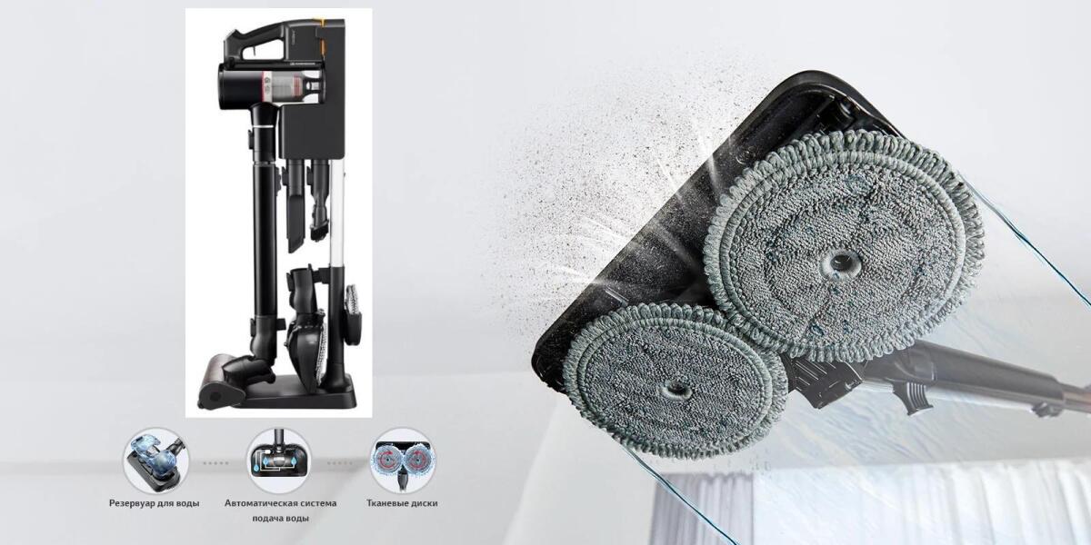 У приборов с опцией влажной уборки есть специальная насадка и небольшой (в вертикальных моделях) встроенный бак для воды — обычно до 450 мл. Даже такой компактной емкости хватает на полную уборку средней трехкомнатной квартиры. Обычно перед использованием режима мойки нужно избавиться от пыли и мелкого мусора, но есть модели, которые умеют одновременно пылесосить и мыть полы, например, LG A9K-MAX1.