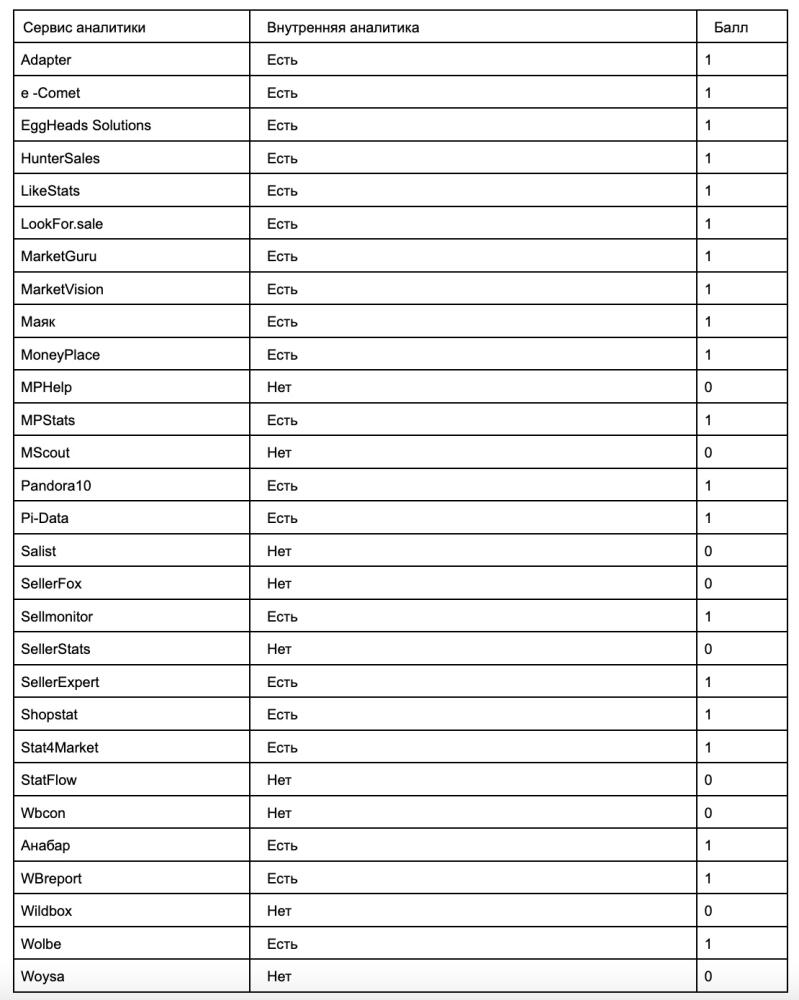 Но когда составили таблицу, то поняли, что расставить баллы просто невозможно. У Shopstate доступ бесплатный, но и аналитика там такая, что платить за нее бы не стали. Баллы расставлять нечестно, поэтому мы присваиваем каждому +1.