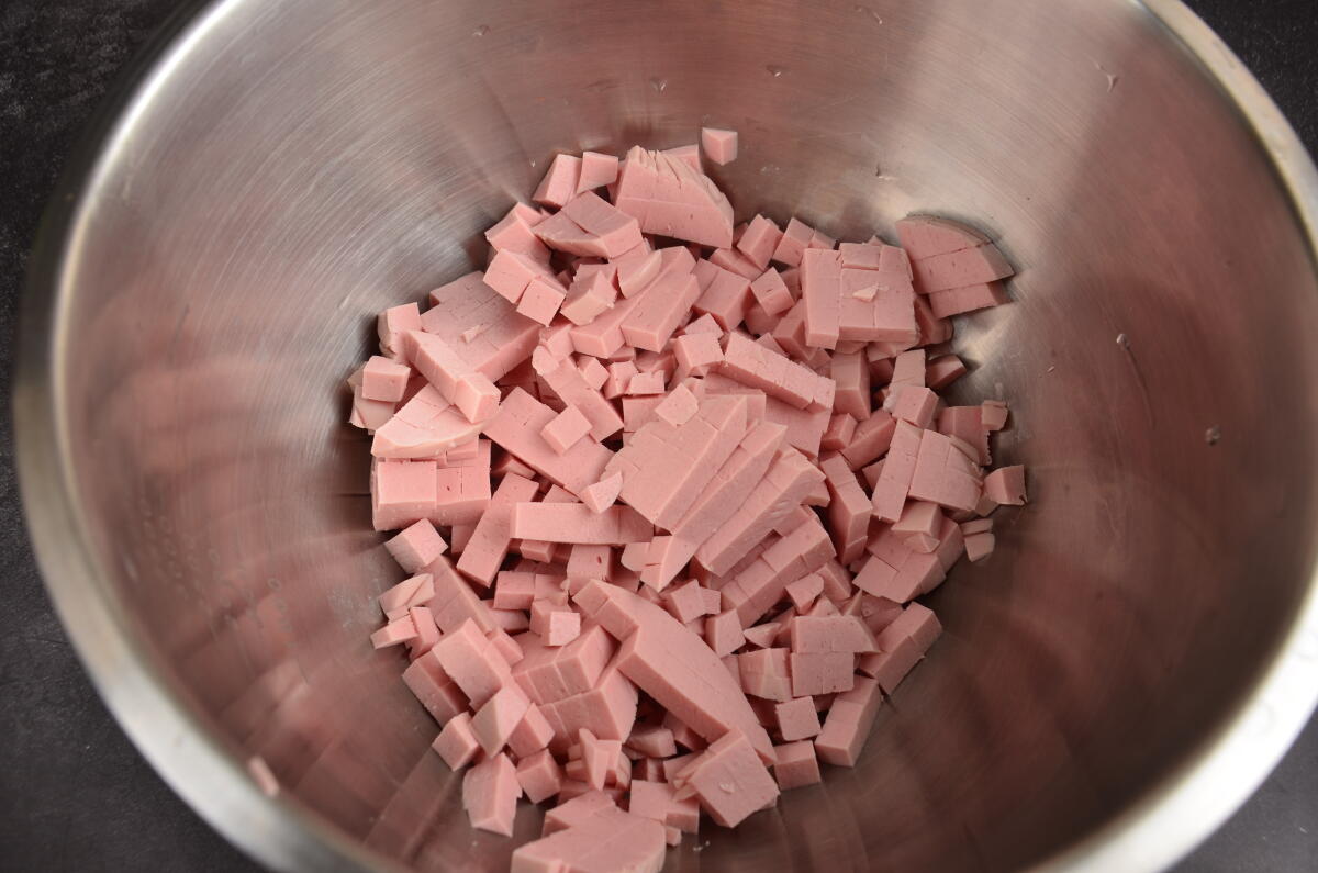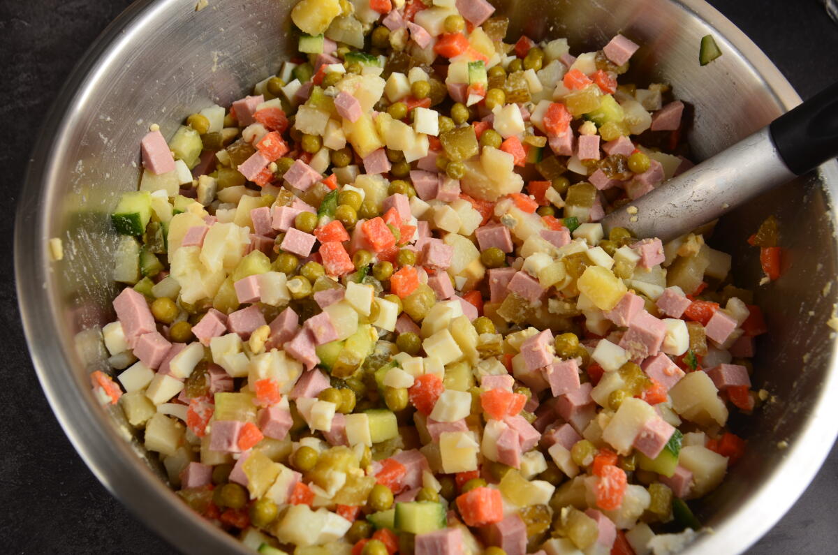 Овощи и яйца сварите, почистите. Используйте подходящую посуду, куда будете складывать все нарезанные продукты. Нарезать их можно в любом порядке. К примеру, первой может стать колбаса. Снимите оболочку, нарубите продукт и положите в емкость.