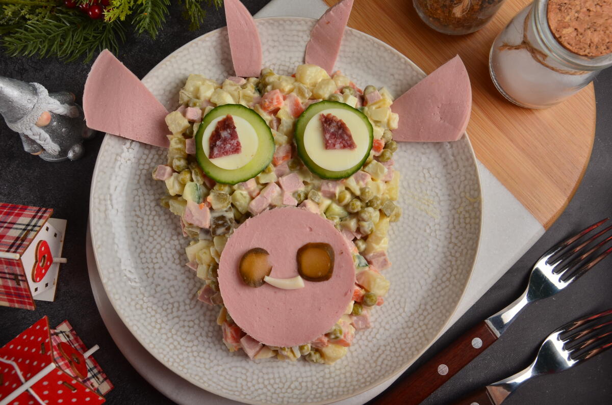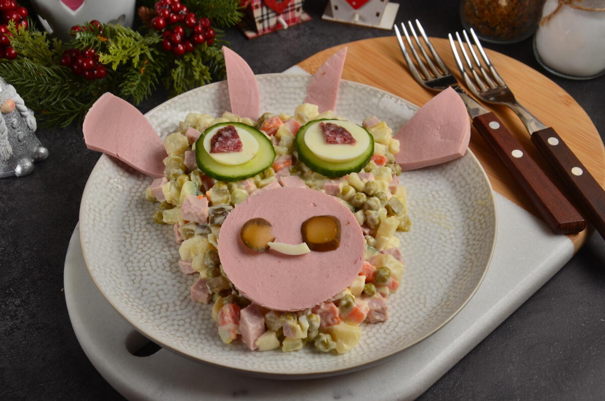 Нарезав подготовленные продукты и заправив их чем-либо (сметаной, майонезом), остается лишь выложить блюдо на плоскую тарелку и придать ему форму символа приближающегося года. Украсить импровизированного бычка можно ломтиками колбасы, маслинами, свежей зеленью.