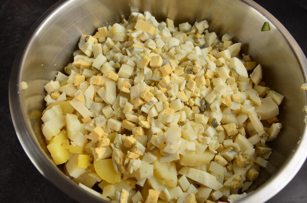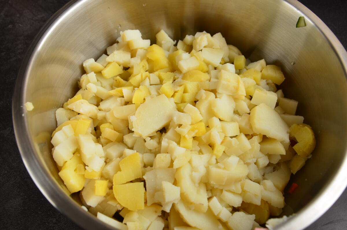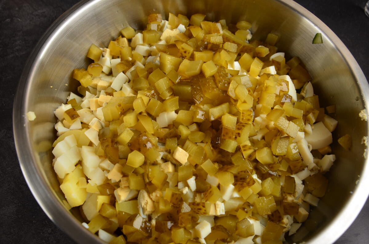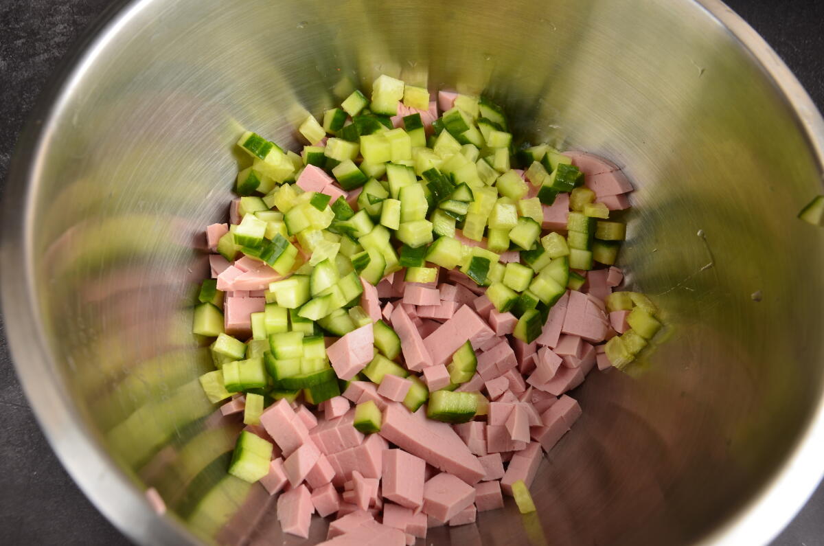 Соленый или кислый огурец нарежьте кубиками. Жидкость (рассол), которая может выделиться при нарезке, не стоит лить в миску с салатом.