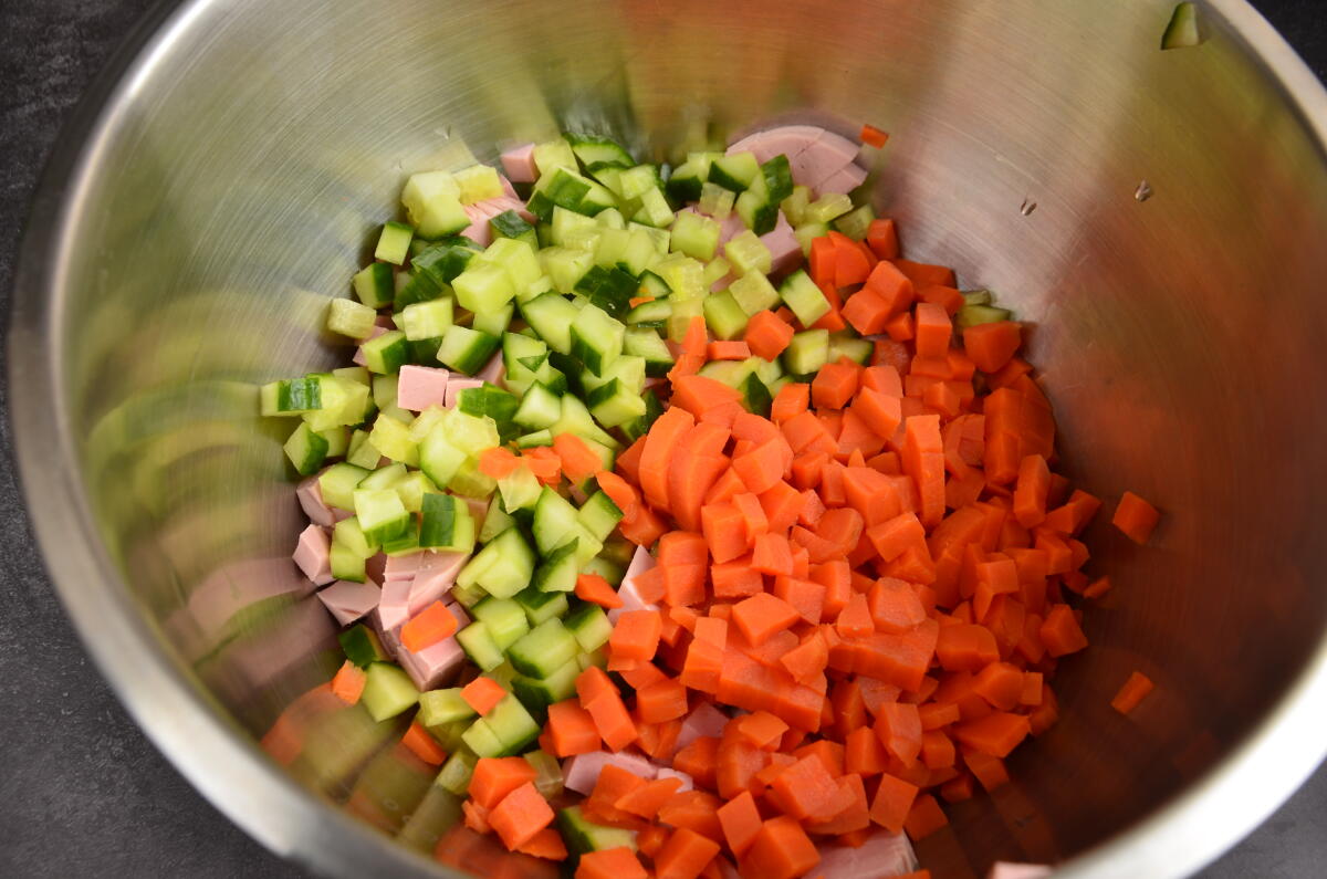 Следующей добавьте в миску покрошенную кубиками морковь.