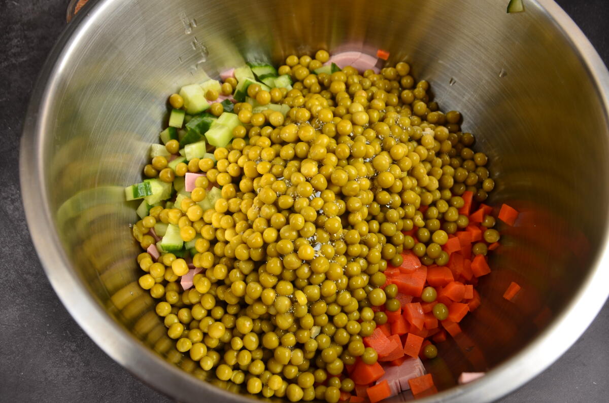 Обычным или консервным ножом откройте банку, слейте жидкость и отправьте горошек в миску.