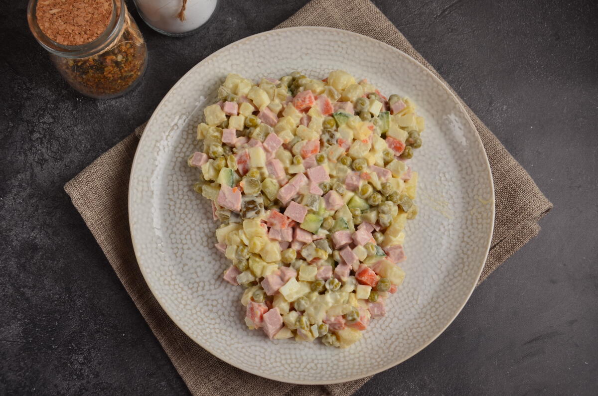 Завершите оформление салата кусочками колбасы, маслинами и подавайте блюдо на стол.