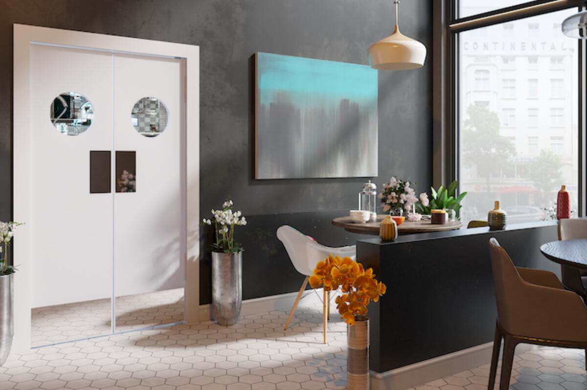 Маятниковые двери, которые ставят между кухней и залом, как раз соответствуют всем этим требованиям. Они герметично отделяют пространство, не дают шуму и запахам вырываться наружу, сохраняют нужный микроклимат. А ещё — экономят время, силы и нервы сотрудникам.