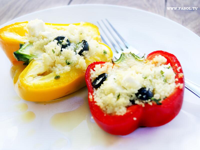 - Перцы разрезать на половинки, очистить от семян. Мелко нарезать оливки, сыр тофу, петрушку, добавить к кускусу и перемешать.