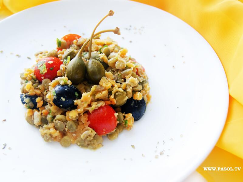 - Чечевицу Футбол смешать с чечевицей Лайрд, добавить помидоры, оливки, каперсы, петрушку, орегано, перец, лимонный сок и оливковое масло. Всё перемешать и подавать.