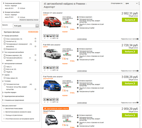 Очень удобно, что сайт представлен на русском языке, это позволяет без проблем внимательно изучить условия договора аренды, а цены в рублях также не заставят напрягаться и считать, в какую же сумму выльются какие-нибудь 87,5 евро. Агрегатор bookingcar.eu хорош еще тем, что не скрывает никаких условий договора аренды, ведь, к примеру, многие прокатчики берут дополнительные деньги за подачу машины к аэропорту, а здесь этого нет, за что заплатил — то и получил. К слову, если вы забронировали автомобиль эконом-класса, а по приезду в аэропорт выяснилось, что авто этого класса в данный момент не могут быть предоставлены — вам выдадут машину более высокого класса, без всяких доплат и промедлений.