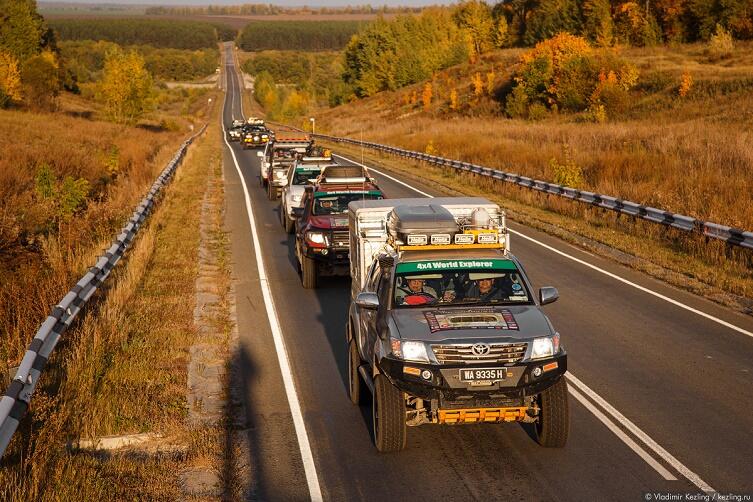 Моя встреча с экспедицией происходит где-то посередине между Саратовом и Тамбовом — на небольшой поляне, где, словно благородные кони, пасутся 14 монстроподобных внедорожников.