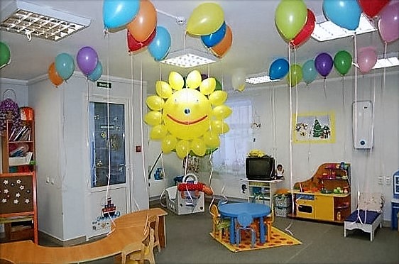 Проще всего запустить под потолок разноцветные гелиевые шарики — это могут быть не просто однотонные шары, а варианты с надписями, в форме звезд, солнца или сердец, с рисунками «мультяшных» героев.
