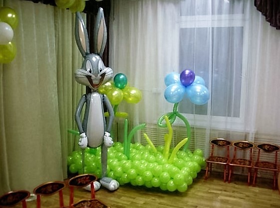 На стенах можно сделать композиции в виде арки или больших цветочков из шаров. Идеальные цвета для детского праздника — зеленый, красный, желтый и голубой.