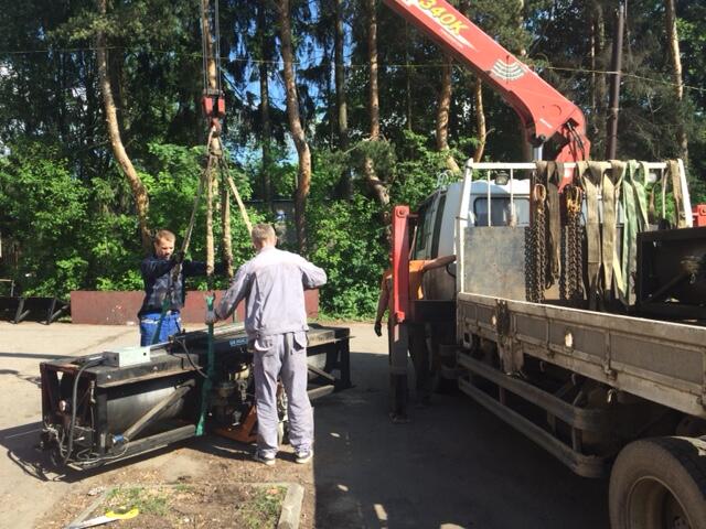 то для погрузки и транспортировки промышленного оборудования применяют сложную технику — кран-манипулятор, погрузчик, лебедку.