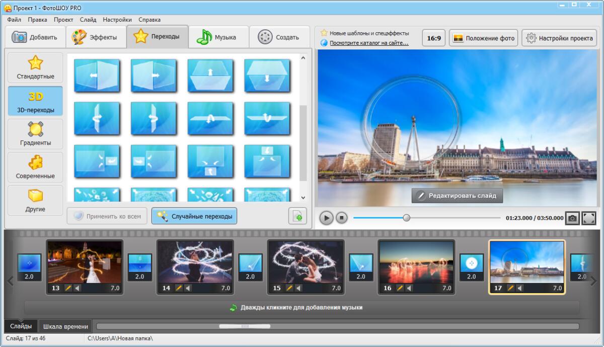 - Добавьте переходы — с ними вы превратите смену фотографий на экране в захватывающее шоу!