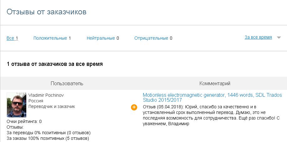 - отзывов о качестве перевода, оставленных другими заказчиками;