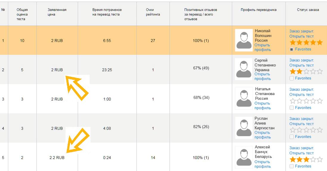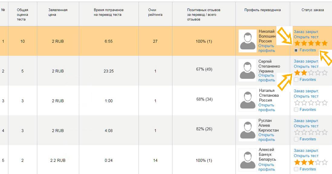 Если заказчик также владеет навыками перевода, в процессе выбора исполнителя существует возможность персонально выделить одного или нескольких авторов, присвоив ему соответствующую оценку (от одной до пяти звезд) за выполнение тестового задания. Здесь же можно добавить автора в «Избранные», данная опция доступна и при переходе в его профиль.