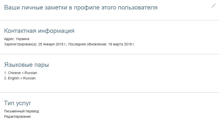 Заказчик может принять решение о выборе подходящего автора не только по максимальному количеству набранных баллов за тестовый перевод, но и исходя из персональных данных переводчика, указанных на его странице: