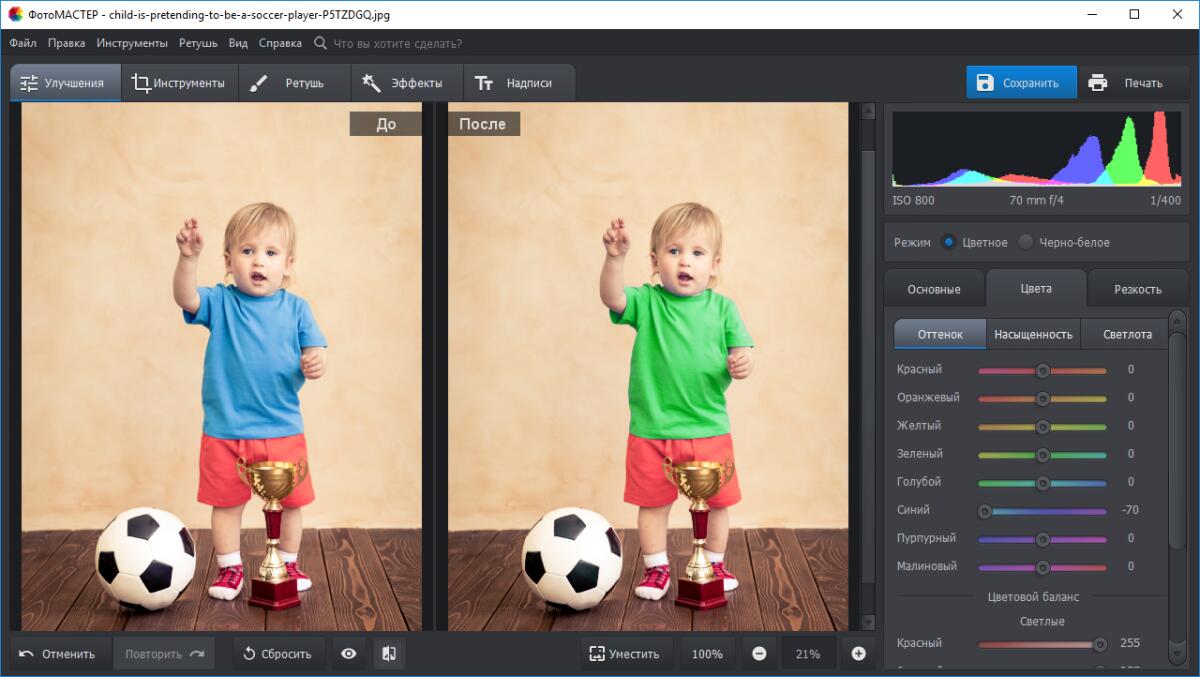 В редакторе можно одним движением полностью изменить один оттенок на фото на любой другой. Для этого нужно перейти во вкладку «Цвет» и сдвинуть подходящий бегунок вправо или влево. Например, на скриншоте ниже футболка мальчика сначала была синего цвета. После сдвига бегунка этого оттенка влево мы получаем зеленую футболку.