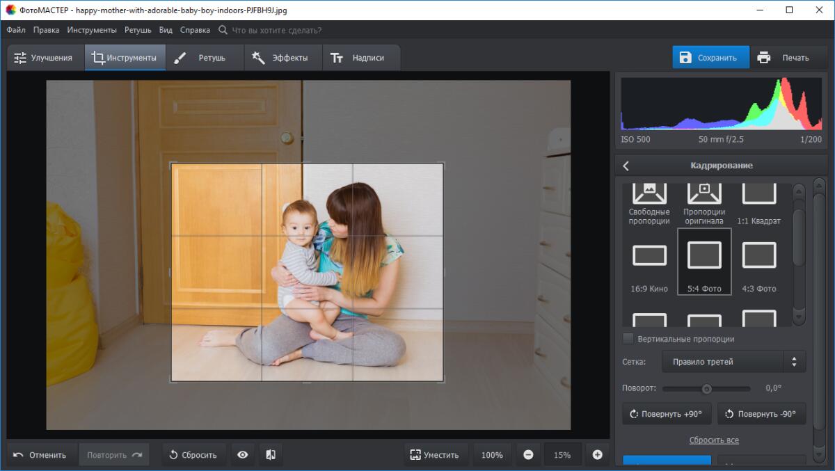 На снимок попали посторонние объекты? Исправьте это, перейдя в раздел «Инструменты» и выбрав функцию «Кадрирование». Вы можете взять стандартные рамки из предложенных — 16:9, 4:3 и другие — или свободные пропорции. На скриншоте мы убрали фрагмент комода и часть желтого мешка, сосредоточив внимание только на девушке с ребёнком.