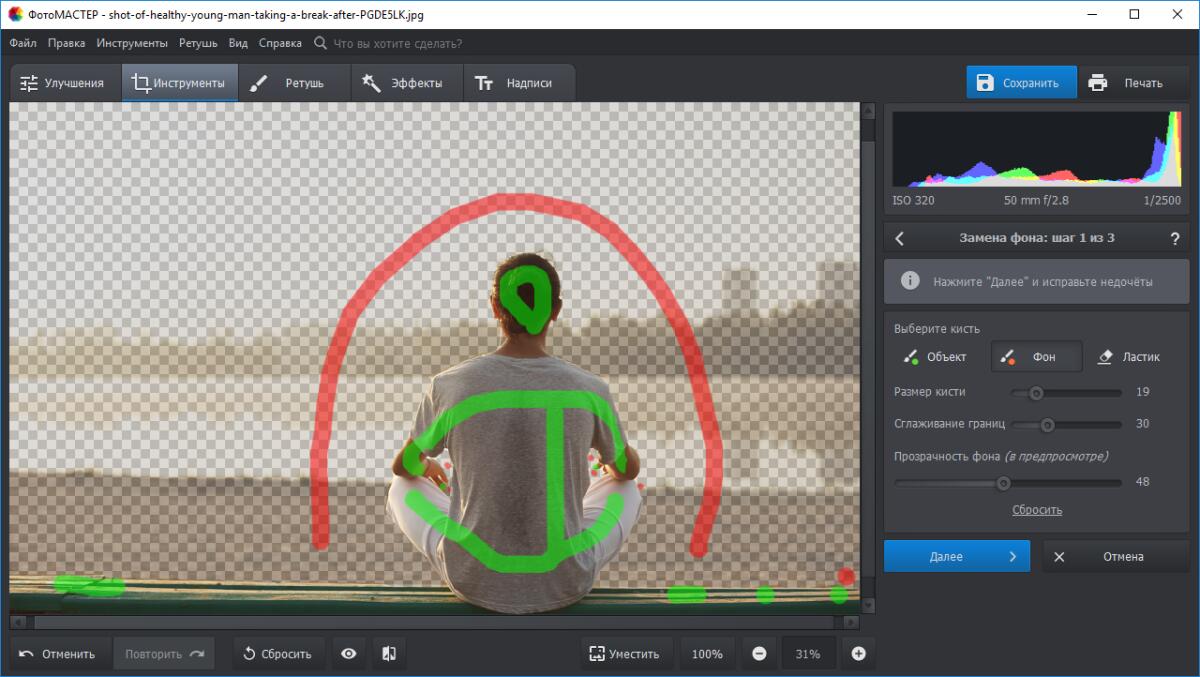 На снимке получился небрежный или скучный задний план? В разделе «Инструменты» есть опция «Замена фона», которая позволит за пару минут перенести человека с тусклой локации на интересную. Достаточно просто отметить зелёной кистью объект, а красной — ненужную часть снимка. Не придётся долго и муторно обводить контуры. Пара штрихов — и «ФотоМАСТЕР» автоматически уберёт лишнее. Останется только немного скорректировать границы.