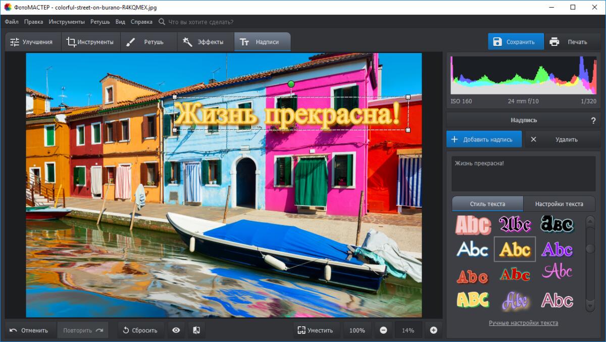 В разделе «Надписи» можно украсить изображение симпатичным текстом, наполняя снимок новым смыслом. Обширный каталог красочных шрифтов позволит сделать действительно привлекательную яркую надпись.