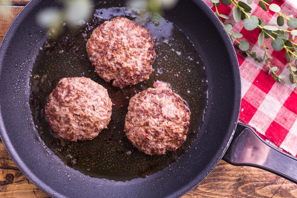 Подрумяниваем на сухой сковороде половинки булочек с одной стороны.