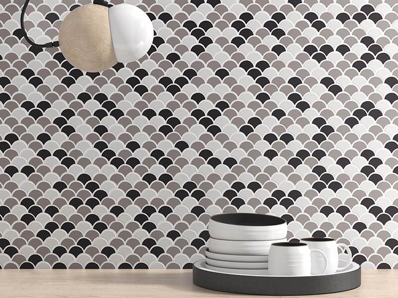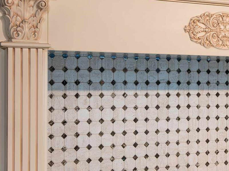 Цветовая палитра фоновой мозаики обычно решена в однотонном варианте, хотя встречаются и исключения в виде смешанных оттенков. Для того, чтобы оформление не выглядело слишком скучным, предлагается использовать специальные элементы, такие как вставки, бордюры, панно и прочие декоры. Если в комплекте коллекции они отсутствуют, их всегда можно приобрести отдельно.
