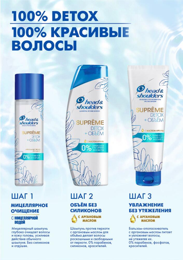 Head & Shoulders знает, что необходимо коже головы, и представляет Supreme Detox + Объём — первый трехступенчатый комплекс для волос с мицеллярной водой и маслом арганы, созданный по аналогии с уходовыми комплексами для кожи лица. Комплекс Supreme Detox + Объём был представлен на Всемирном конгрессе дерматологов в Милане и отмечен престижной бьюти-премией Cosmopolitan Skin Awards 2019.