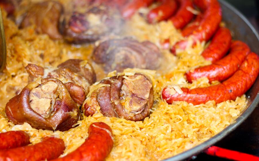 Как капуста станет мягкой и осядет, добавляем в казан квашеную капусту. Примерно столько же, сколько и свежей. Граммов 700−800. Если чуть больше — ничего страшного. Много — не мало. Зато есть гарантия, что всем тем, кто вместе с вами сядет за стол, хватит и никто не останется голодным!