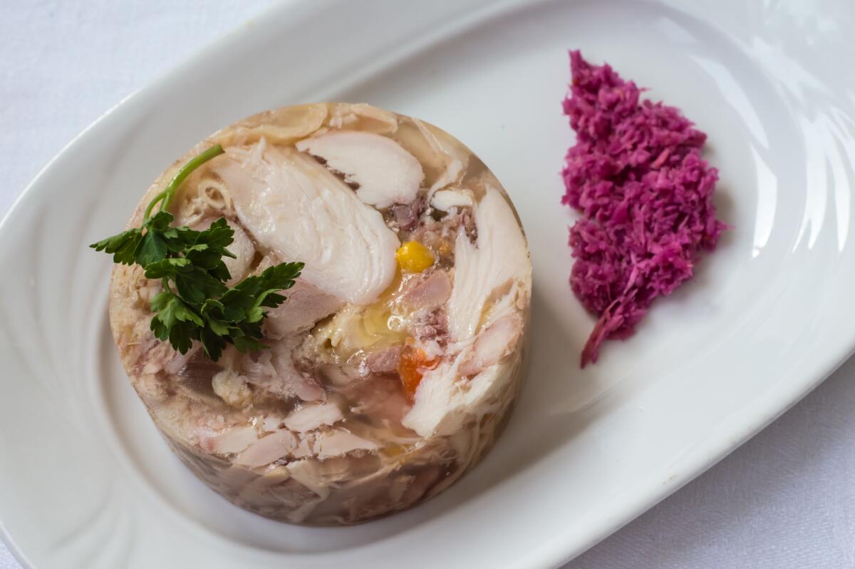 В тёплый бульон (60 градусов) всыпаем 1,5 столовых ложки желатина и даем ему «распуститься», набухнуть. На это необходимо минут 20−30, всё зависит от качества и свежести желатина. Более подробно о том, сколько минут нужно желатину для набухания, можно прочесть на пакетике.