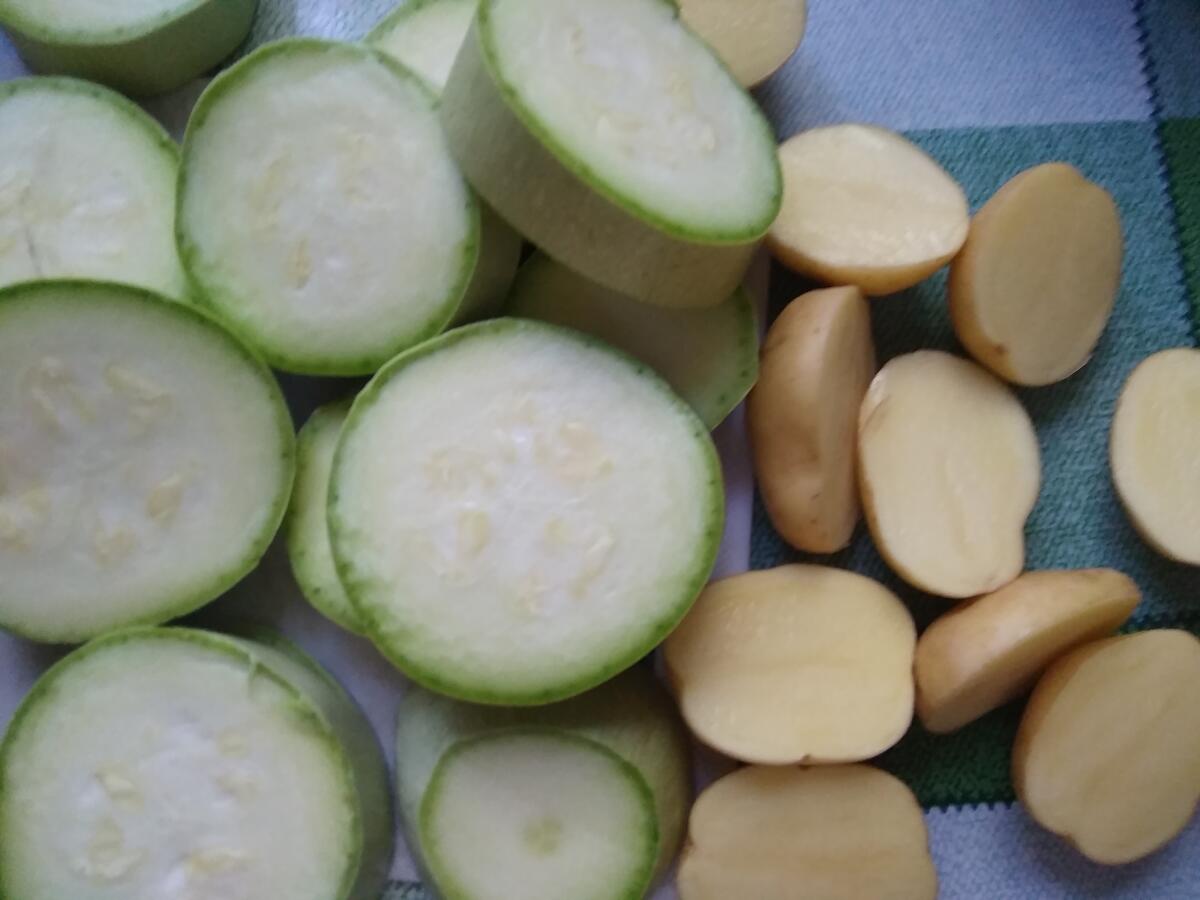 Нарезать кабачки кольцами толщиной примерно 1 см. По желанию можно добавить картофель, нарезать таким же способом, не очищая кожуру (если картошка мелкая, то просто разделить пополам).