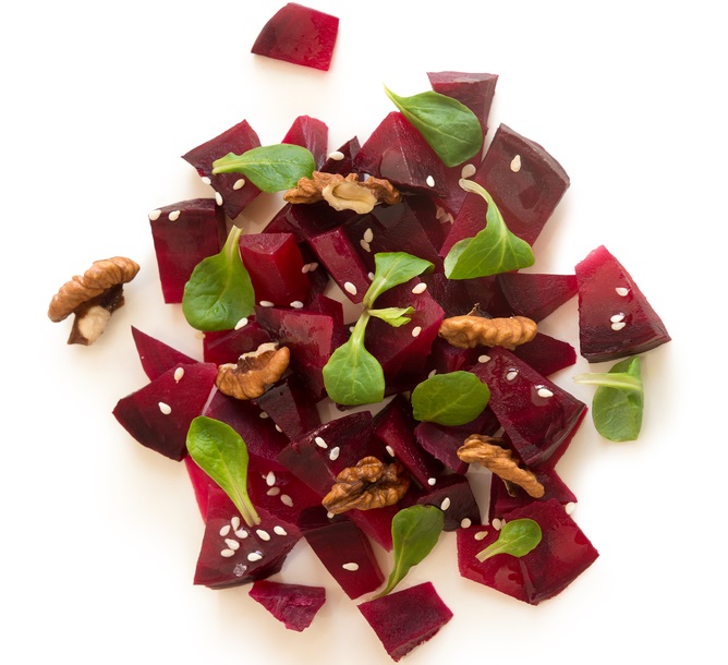 Посыпаем свеклу зеленью валерианеллы, поделенным на дольки ядром 1 грецкого ореха и ½ чайной ложки кунжута.