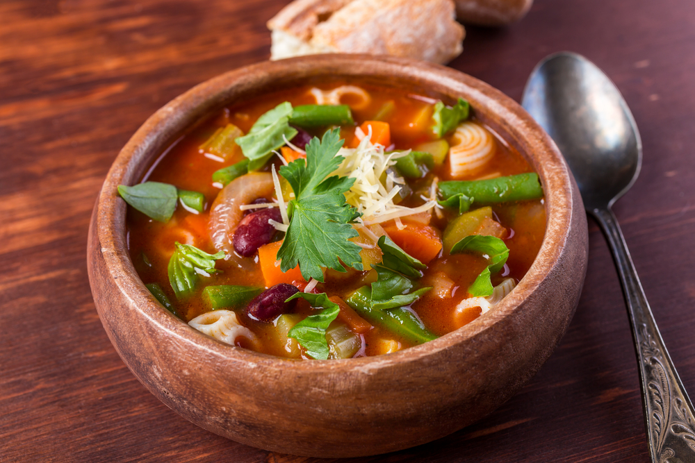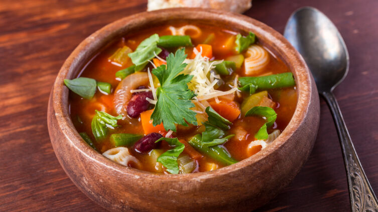 Удивите своих домочадцев легким овощным супом под названием «Минестроне». Речь идет о блюде итальянской кухни. Его традиционно готовят из бобов, лука, сельдерея, моркови и томатов.