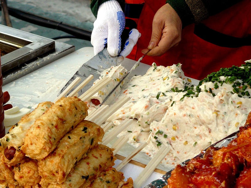 На одном из первых мест по степени удивления по праву должен находиться оден, или омук — это рыбные котлетки, нанизанные на палочки и сваренные в бульоне или пожаренные в кипящем масле. Их продают в Сеуле повсюду, и места продажи такого блюда производят неоднозначное впечатление.