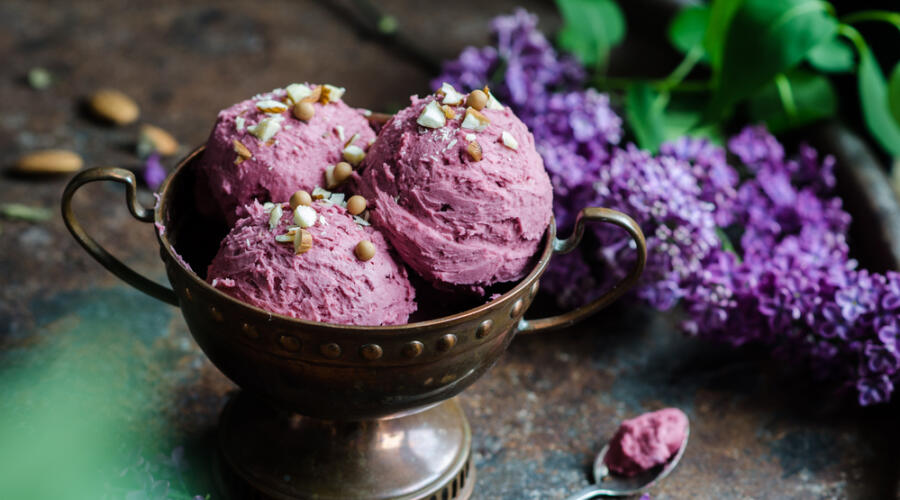 Подавайте холодное лакомство из сирени порционно в креманках, придав ему форму шариков.