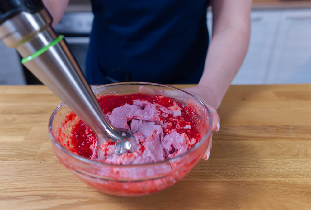 8. Перелейте получившуюся заготовку в пищевой контейнер. Закройте его крышкой и отправьте в морозильную камеру на 4−5 часов. Потребуется время от времени извлекать контейнер из холодильника и перемешивать его содержимое.
