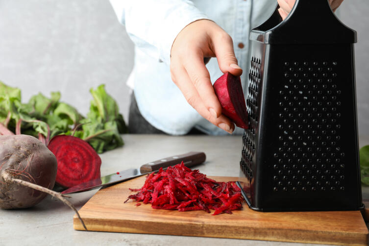 Свеклу чистят, моют, мельчат в блендере. Сок из свекольной массы отжимают. Полученный свекольный жмых отправляют в глубокую миску. Сок можно выпить.