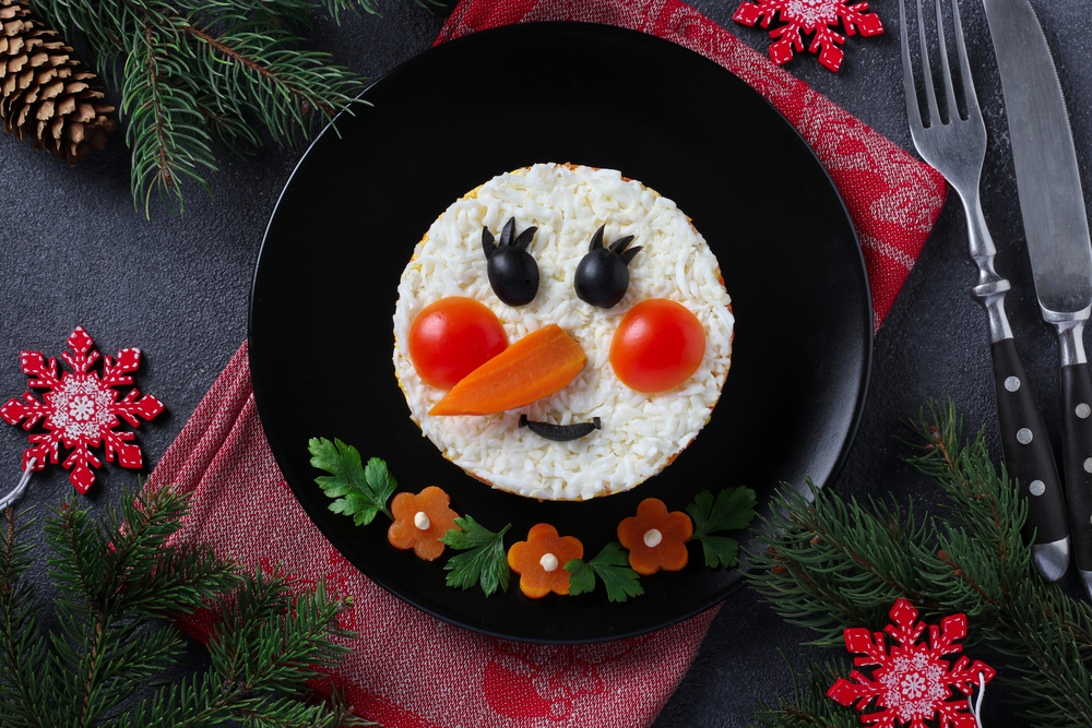 Будет не лишним дополнить завтрак салатом в форме снеговика для создания предновогоднего настроения.