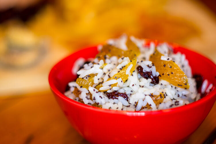 - Соедините вареный рис с сухофруктами, маковой сладкой массой, орехами. Заправьте кушанье жидким медом. Перемешайте.